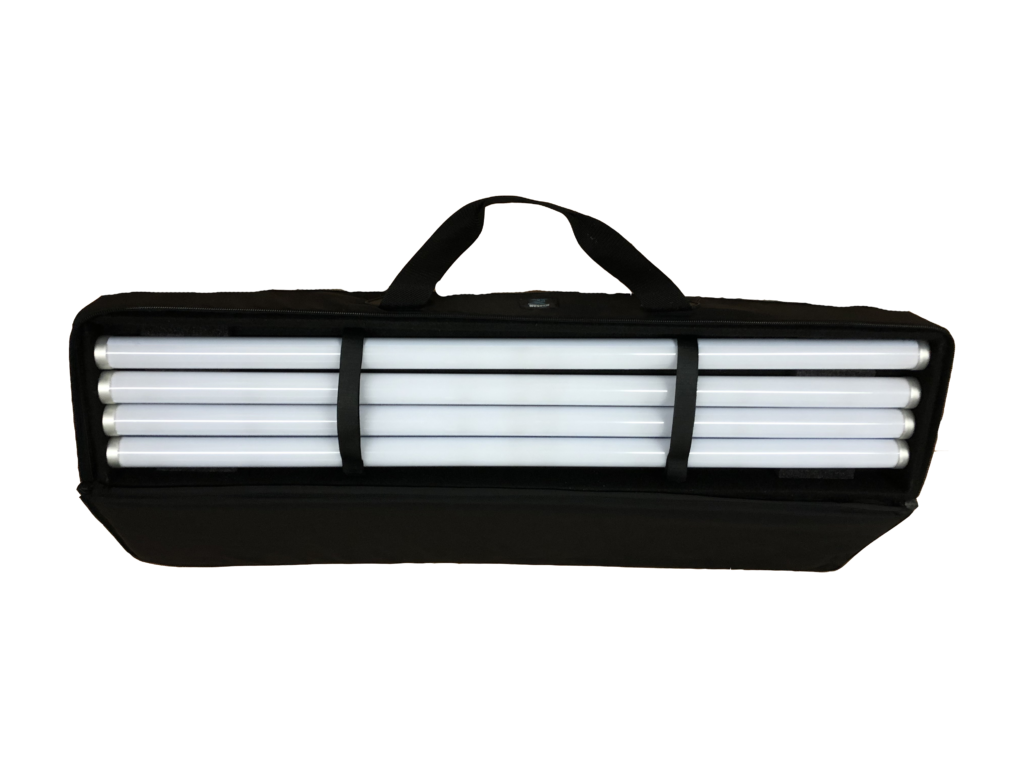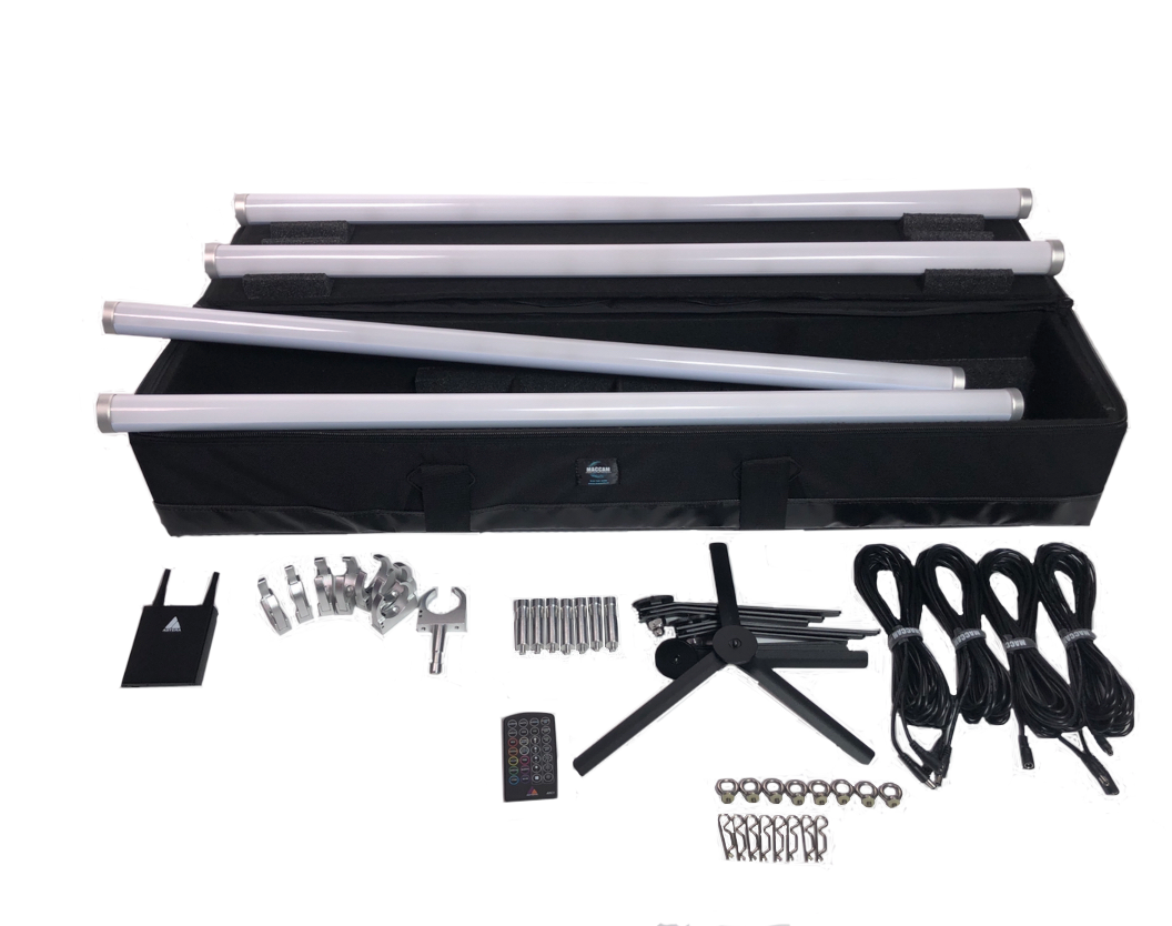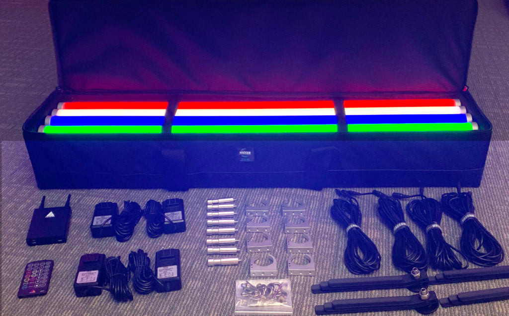 Specially designed 5/8” baby pins, DC cable packs and individual power supplies all come together with four tubes in this light-weight zipper-top case. A perfect match of components for when you need a quick max-output RGB solution that reaches anywhere in the room with single PSU’s.
