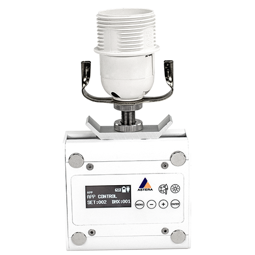 Connect the integrated cable to your bulbโs DC connector to power it up. While connected, the Power Station acts as a remote display to program DMX addresses and settings which the bulb will store in its memory. It can also set colors, effects, brightness etc which the bulb will continue to display when in a powered lamp socket or connected to a power bank. Apart from its backside magnets the Power Station features an airline track to attach mounting accessories such as Babypin and Single Stud Ring.