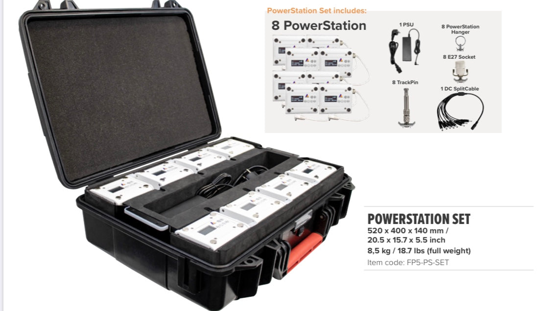 Set of 8 PowerStations with Case and Accessories. Comes with 8x PowerStations, x8 TrackPins, 8x PowerStation Hangers,1 x 24VDC PSU, 1x 8-way adapter cable.
