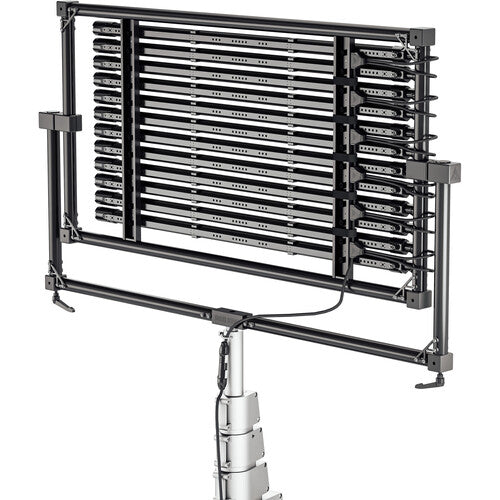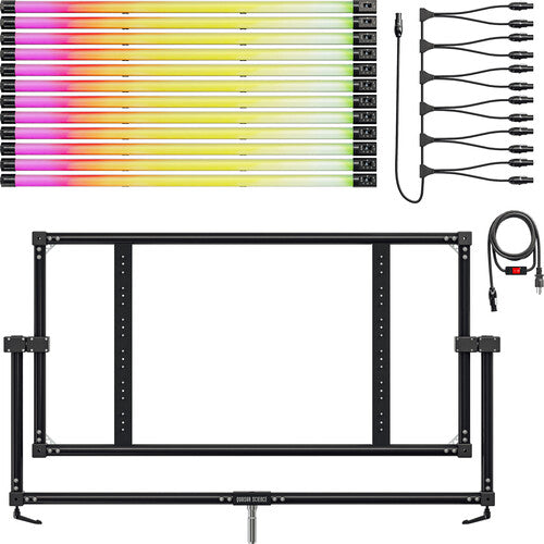 The Rainbow 2 offers a wide variable color temperature range from 1750K to 10,000K, making it ideal for any lighting challenge—from matching ambient light to exploring creative expression. With individually addressable pixels in RGB mode, this setup gives you access to millions of custom colors, allowing for full dynamic control over your lighting effects.Each fixture is fully dimmable from 0 to 100%, and you can adjust both color and brightness directly on the fixture or remotely using multiple control options, including DMX, wireless DMX, Bluetooth, Wi-Fi, Art-Net, and sACN.Frame Your World in a Whole New Light:Ossium Frame Arrays are the perfect lighting solution for immersive image-based lighting, whether for a virtual set or real-world applications. They surround your subject with smooth, full-spectrum light for a polished, professional look.Build a Wall of Pixels with Smarter Rigging:Using the integrated Ossium Rail, you can combine both Rainbow 2 and Double Rainbow tubes to create a stacked, pixel-controlled array of light. The solid Ossium Frame offers secure, durable support, while the Multibank adapter powers up the array and allows for dynamic lighting control. With direct connections to industry-standard control protocols—including DMX, Bluetooth, and sACN—you have full control over every detail of your lighting setup.Unleash the Power of Image-Based Lighting:This array offers more than just light—it allows for dynamic, image-based lighting with unique data sent to each pixel in the array. This creates dramatic, full-spectrum lighting effects perfect for syncing with virtual environments. Quasar's VRGB profiles take this one step further, integrating with virtual production engines and rendering seamlessly with volume walls, making your production more realistic and immersive.Modular and Flexible for Any Setup:The Ossium Frame Array is designed for flexibility. It’s larger than your average panel, offering a unique feature: individual tubes can be removed as needed to adjust your lighting configuration. The Rainbow 2 delivers high-quality tunable white light along with high color saturation, all with smooth, flicker-free dimming in a compact, low-profile design.