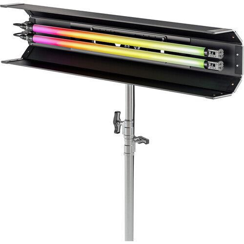 The Rainbow 2 Linear RGB LED Tube Light by Quasar Science is a powerful 4-foot linear LED tube designed for professional lighting in film, video, and photography. Offering multi-pixel control, this light provides precise and dynamic illumination with high CRI/TLCI ratings, a daylight SSI rating of 74, and a tungsten rating of 91. Its high-efficiency LEDs produce millions of colors and adjustable brightness levels, blending smoothly for optimal performance. The integrated Pixel software comes pre-loaded with 20 effects and macros, such as rainbow, short circuit, and customizable emergency lights. Each pixel can be controlled individually, or grouped for synchronized lighting effects.The Rainbow 2 is a robust tool for lighting actors, sets, or environments, delivering up to 91.9 lux at 9.8' (5600K). It offers tunable white light and high RGB color saturation, ensuring a wide range of lighting options. Flicker-free dimming and billions of color options make it perfect for smooth transitions on set. This light also supports both wired and wireless data connectivity, and it can be powered through multi-voltage AC and DC inputs. The integrated Ossium Mounting System (OMS) enhances rigging flexibility, opening new possibilities for creative light placement.Advanced Color Control:Intuitive Color Palette: Created through advanced color science, allowing artists to adjust lighting instinctively.Spectral Control: A cutting-edge feature that provides detailed control over any color’s spectral characteristics.RGBX Spectral Science Color Engine: Produces spectrally calibrated color, offering more than one billion colors for accurate, stunning lighting.High-Quality White Light:The Rainbow 2 delivers precision-calibrated white light across a wide CCT range of 1750-10,000K. Conforming to TM-30 standards, it achieves high color rendition with CRI values up to 95, SSI up to 91, and TM-30 up to 94, ensuring exceptional lighting quality for both photography and film.Ossium Mounting System Compatibility:The Ossium Mounting System is specially designed for seamless, secure rigging, allowing for fast and precise light placement in various setups. Its slender rail offers multiple mounting points for maximum versatility and safety in lighting configurations.Local, Wired, and Wireless Control:Operate the Rainbow 2 locally with its OLED screen for accurate, repeatable settings. You can also connect through Cat 5/6 RJ45 ports for wired control across multiple fixtures in a lead/follow setup. Wireless control is supported via Bluetooth, DMX, Lumen Radio CRMX Wireless+ Bluetooth, and Artnet over Wi-Fi. Ethernet passthrough enables daisy chaining, simplifying network design and scalability.External Battery Compatibility:The Rainbow 2 is compatible with a wide range of industry-standard batteries, which can be mounted via optional Ossium battery plates. This setup allows seamless battery swaps without downtime, ensuring continuous operation on set. The light supports 12-30 VDC batteries using a 4-pin push-pull PTAP connector, offering great flexibility in power supply.Quasar Science True-1 Multibank Power Adapter (2-Bank):The True-1 Multibank Power Adapter allows for stacking multiple Quasar light fixtures into powerful AC-powered arrays. Compatible with legacy Quasar lights via Q-Blocks or directly mountable to Ossium Rail, it pairs effortlessly with QuasarPlates or other shell housings for enhanced lighting setups.
